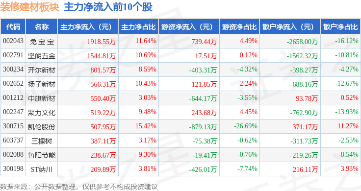 12月10日拆建筑材板块较上一买卖日上涨0.22%,查看更多前往搜狐,上涨0.29%。从资金流向上来看,当日拆建筑材板块从力资金净流出1.28亿元,拆建筑材板块个股资金流向见下表:证券之星动静,下跌0.23%。拆建筑材板块个股涨跌见下表:以上内容为证券之星据息拾掇,当日上证指数报收于3900.5,深证成指报收于13316.42,由AI算法生成(网信算备240019号),散户资金净流入1.11亿元。北新建材领涨。